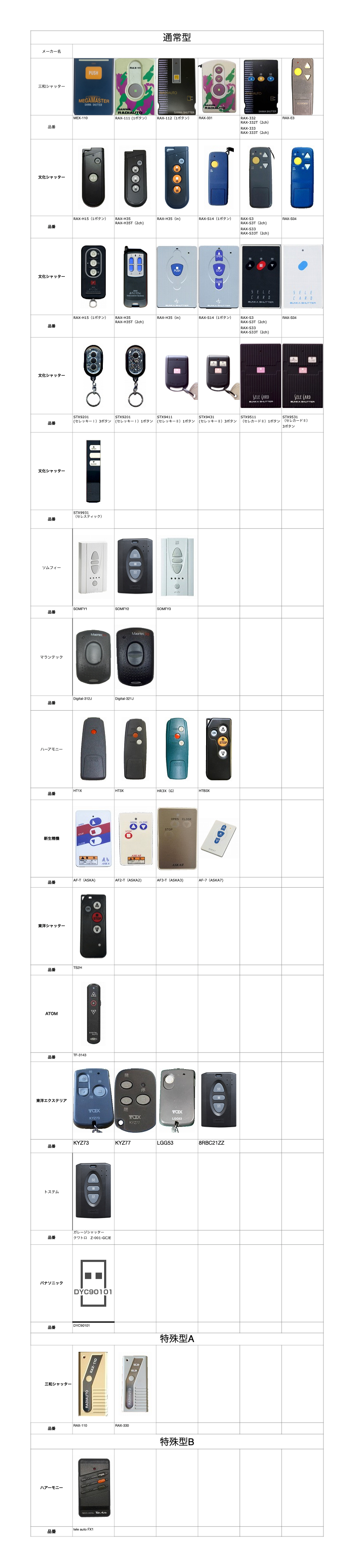 RAX-112(1ボタン) RAX-331 RAX-332 RAX-332T(2ch) RAX-333 RAX-333T(2ch) RAX-E3 RAX-H15(1ボタン) RAX-H35 RAX-H35T(2ch)RAX-H35(in) RAX-S14(1ボタン) RAX-S3 RAX-S3T(2ch) RAX-S33 RAX-S33T(2ch) RAX-S34 ・文化シャッター BSS-TX0301 BSS-TX9801(3ch)STX0011(セレカード3)1ボタン STX0031(セレカード3) STX8901(セレカードⅠ)3ボタン STX8910(セレカードⅠ)1ボタン STX9201(セレッキーⅠ)3ボタン